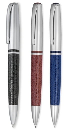 | Kit caneta e lapiseira de metal com detalhes de couro sintético, em estojo de couro sintético. |