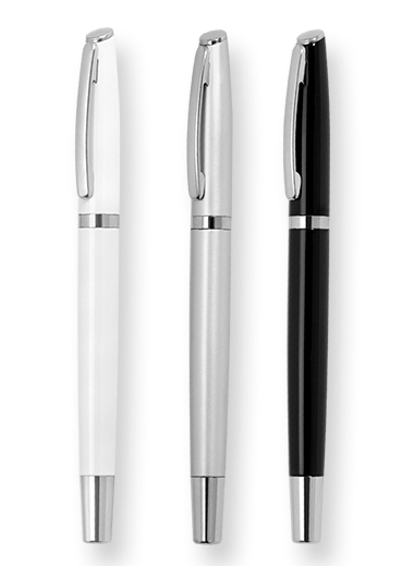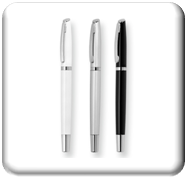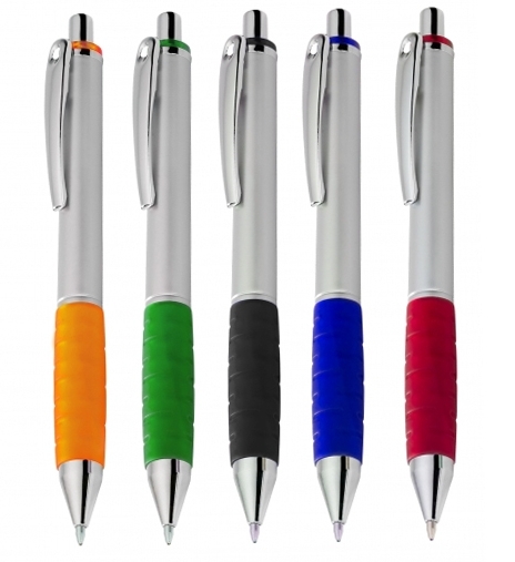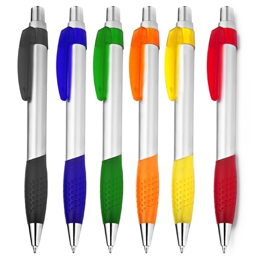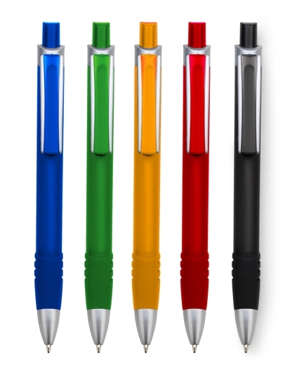 | | Caneta plástica com detalhe de quatro aneis prata. |
