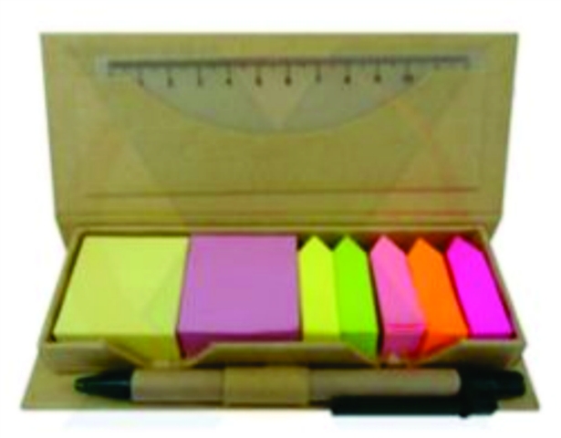 | | | Bloquinhos de anotações ecológico, acompanha régua plástica, post-its coloridos e caneta reciclável. |