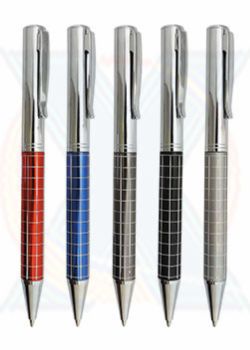 | | Caneta de metal, detalhada em metade xadrez, e a outra metade lisa, na cor prata. |