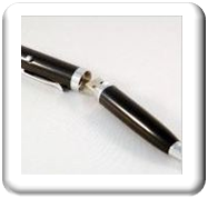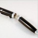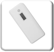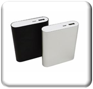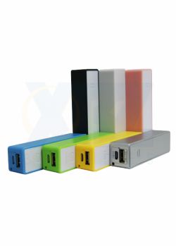 | Power Bank de metal com uma entrada USB e uma micro-USB, botão para ligar e luz indicando a bateria |